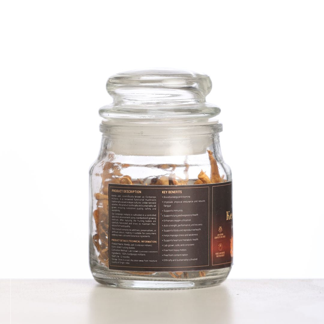 Kida Jadi, commonly known as Cordyceps, is a prized functional mushroom traditionally associated with energy, stamina, and vitality. Our lab-grown Cordyceps militaris is cultivated in a controlled environment to ensure purity, consistency, and sustainable sourcing—making it a safe and reliable alternative to wild-harvested varieties.