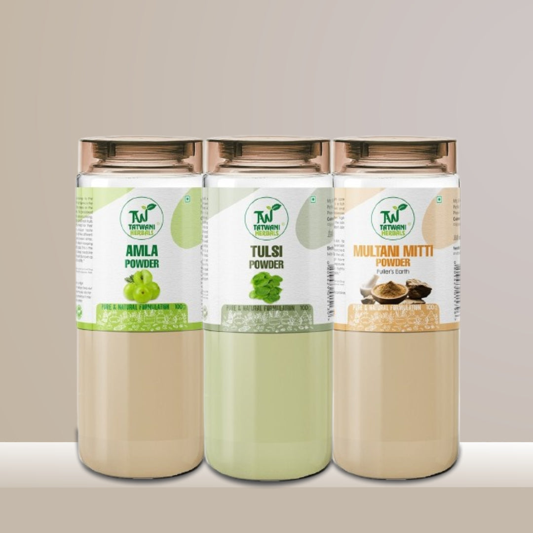 Revitalize your health and skincare routine with **TATWANI HERBALS Multani Mitti Powder, Amla Powder, and Tulsi Powder Combo**. This 300g pack, with 100g of each powder, is designed to promote immunity, respiratory wellness, and natural beauty for both men and women. **Multani Mitti Powder**, a natural skincare remedy, deeply cleanses, soothes, and nourishes the skin, leaving it radiant and refreshed. **Amla Powder**, rich in Vitamin C and antioxidants, boosts immunity, supports healthy hair, and rejuvenates the body. **Tulsi Powder**, renowned for its respiratory and immunity-boosting properties, helps combat seasonal illnesses and promotes overall well-being. Made from 100% pure and natural ingredients, this combo is free from additives and preservatives, ensuring you receive only the best. Ideal for both internal and external use, this Ayurvedic blend is a versatile addition to your wellness regimen. Experience the synergy of health and beauty with TATWANI HERBALS – your trusted partner in holistic care.
